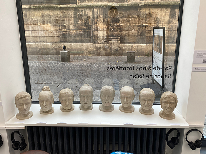 Dans cette galerie où les nombreuses œuvres sont très proches les unes des autres, celles qui ouvrent l’exposition, « Antipodes », sont les plus récentes et donnent le ton. Sandrine Saïah a interviewé 8 personnes de 17 à 77 ans sur la question de la place du numérique dans leur vie. Ensuite elle a réalisé 8 bustes en terre, « Têtes » (2023), associés à des œuvres d’une autre nature : des séries numériques d’impression sur papier « Profil numérique » (2023) et « Regards ubiquistes » (2023).