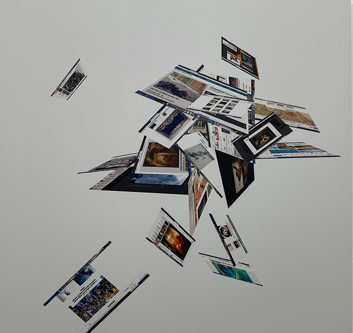 Tandis qu’avec la série d’impressions sur Dibond Images fuyantes, elle explore l’espace numérique dans sa platitude, son encombrement, sa systémique pour le désordonner, le désorienter, l’aérer. À travers ces nouveaux champs de vision, l’artiste-anthropologue donne de la profondeur et de la perspective à ces images qui nous font face à plat. Il s’agit d’expérimenter un autre rapport à l’image qui ne serait pas en deux dimensions.