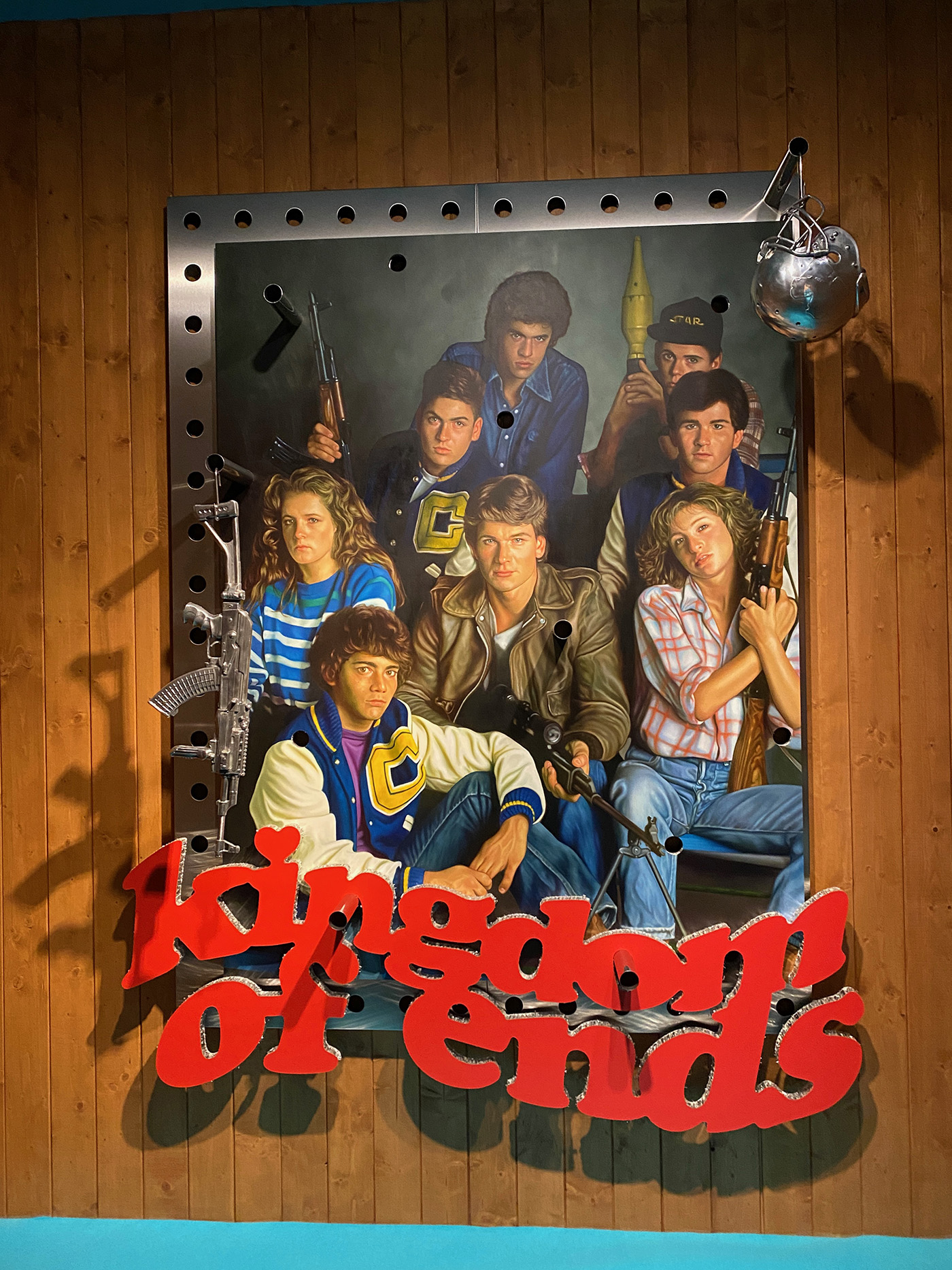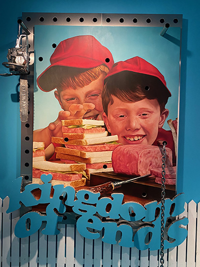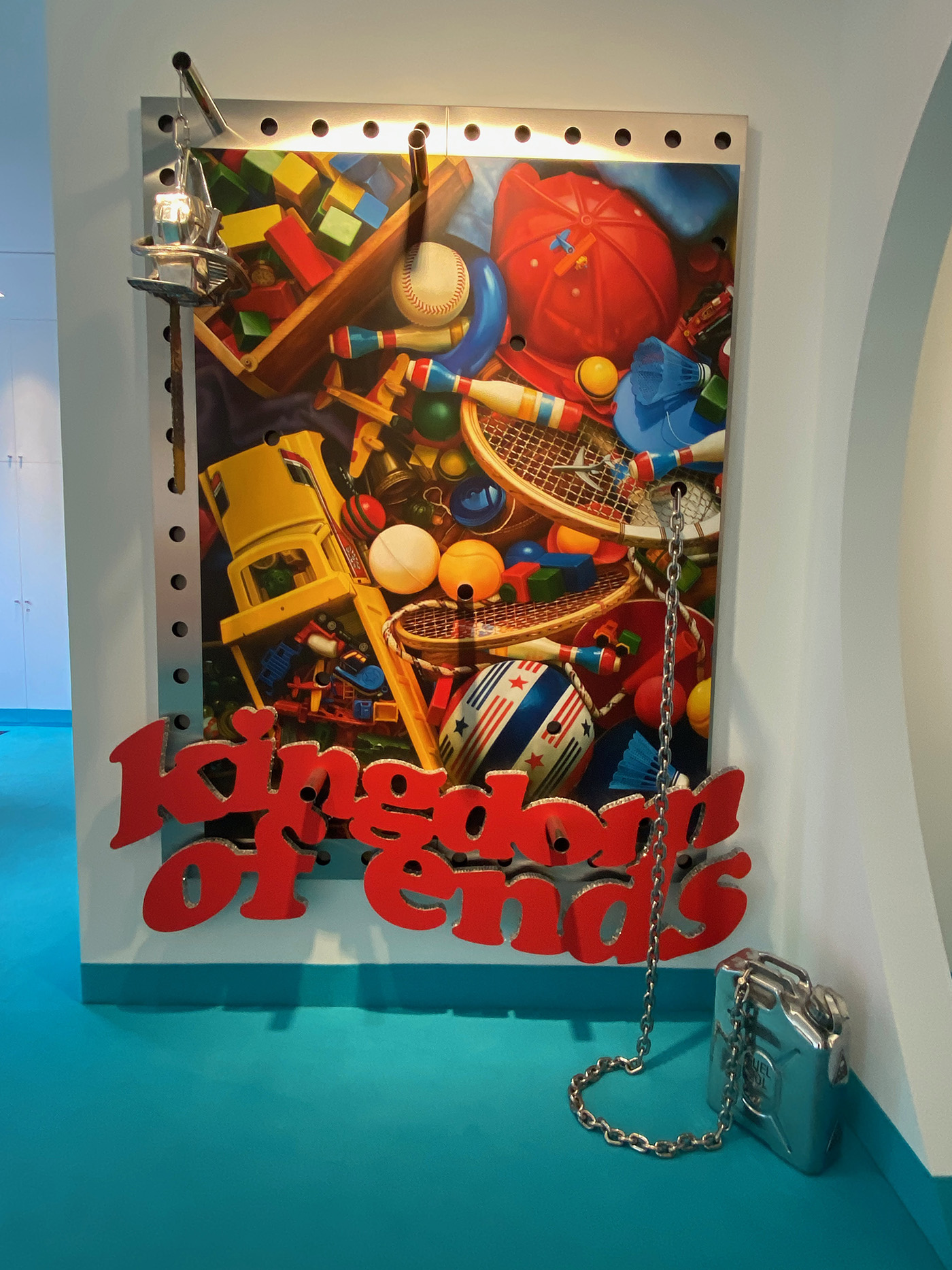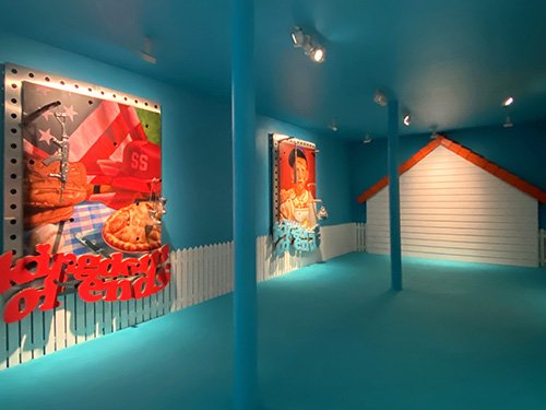 Entrer dans l’exposition c’est faire l’expérience d’une immersion dans un monde décalé, acide et doucereux, où l’on est obligé de mettre des surchaussures bleues pour marcher sur une moquette bleue immaculée avant de plonger dans le passé. D’immenses portraits de jeunes incarnant le jeu et le bonheur de la consommation des années 60 vous accueillent et tentent de vous attirer dans le « Kingdom of ends », le règne des fins, tableaux qui ne cachent pas le royaume de la publicité tentant de vendre du rêve. Chez Templon, on entre dans une œuvre totale et on en ressort choqué ou désenchanté, mais assurément pensif !