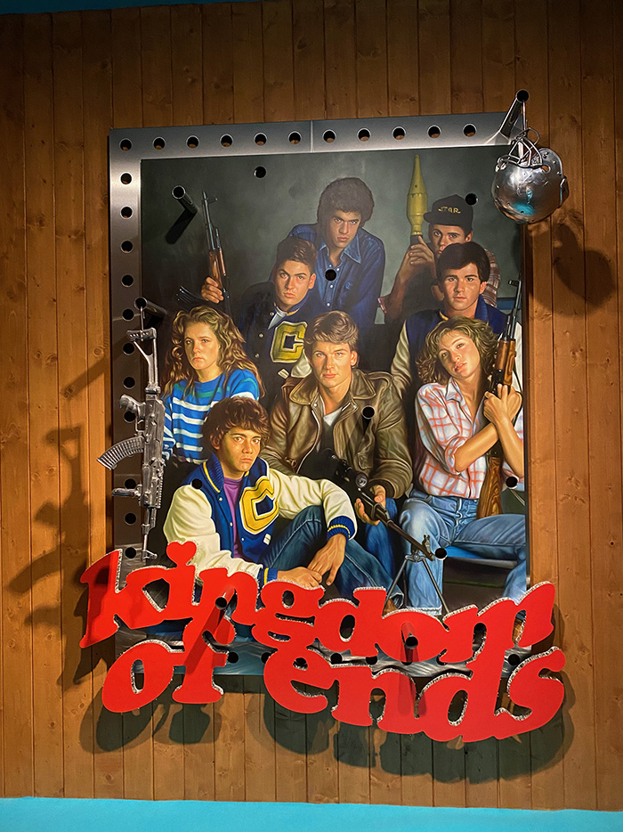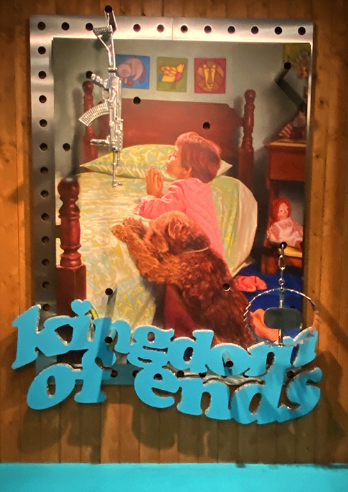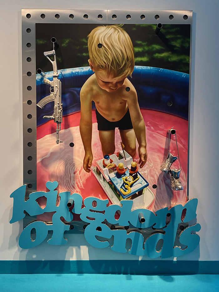 Ici l’hyperréalisme, encore lui, associe la peinture, la sculpture, l’installation. Tout semble rieur et sent bon la vie et le rêve des enfants ; or, avec des armes accrochées sur les grands portraits et des reproductions en aluminium de divers objets, la violence est latente et dit beaucoup de choses sur la société américaine ou plutôt la manière dont l’artiste la ressent.