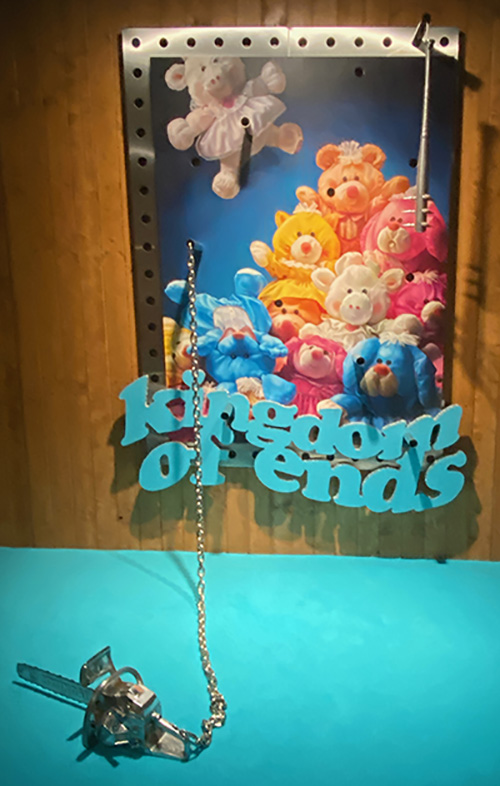 La contradiction [2] entre les deux est très forte et renforcée par la phrase calligraphiée « Kingdom of ends », car ce sont les royaumes de la consommation et de la violence qui sont évoqués formellement de manière équilibrée et non l’idéal porté par Kant. L’artiste a en outre composé pour Templon une musique à partir de morceaux des années 50-60 qui agissent comme des ritournelles.
