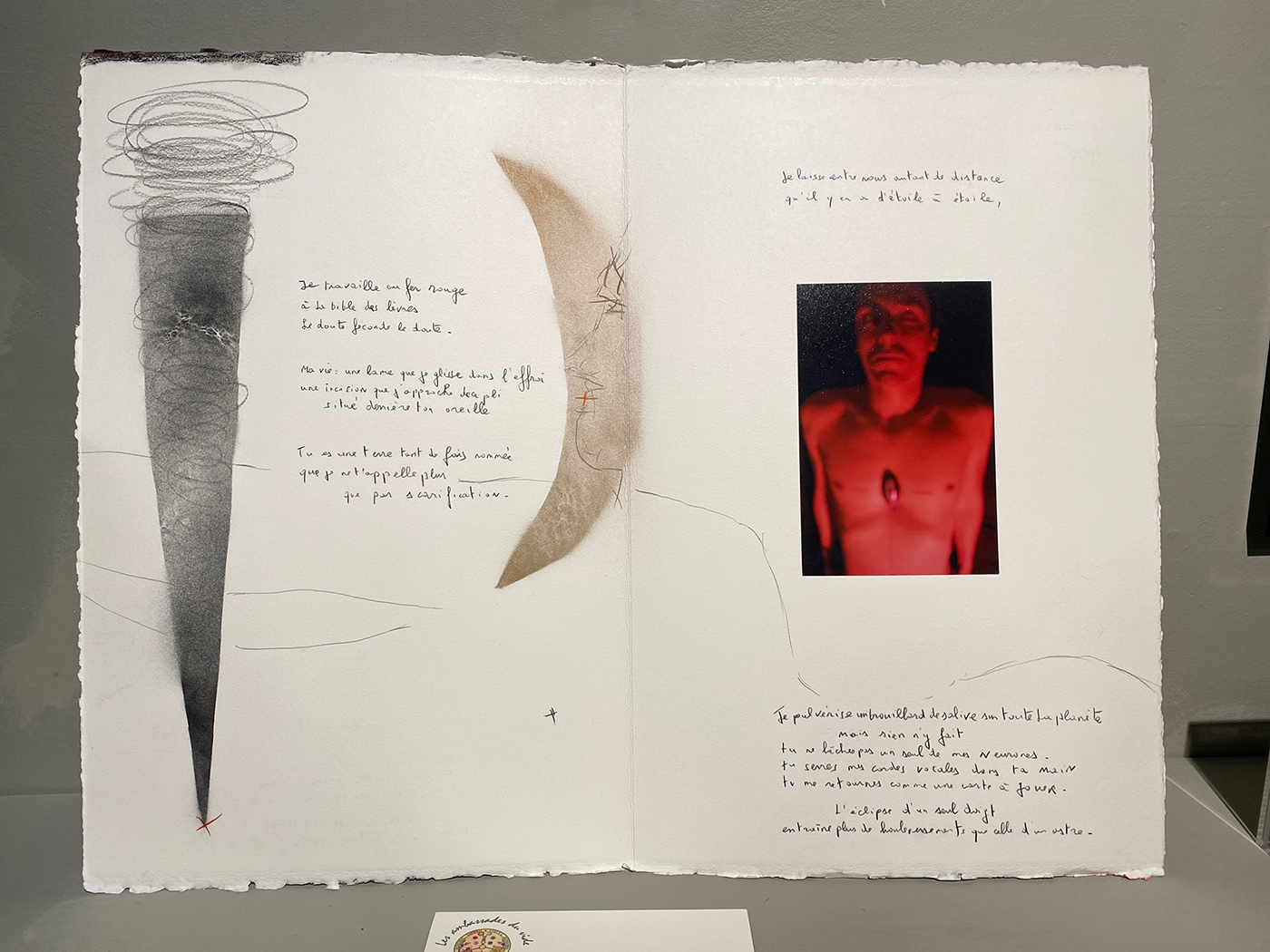 La force de son œuvre tient dans cette alliance si particulière entre trace visuelle des corps et économie des mots. Ses livres d’artistes sont fascinants par l’équilibre de son écriture qui s’intègre à ses photos et dessins. L’or, le rouge, le noir, les lignes de séparation dessinées dans ses œuvres deviennent partie prenante de sa poésie.