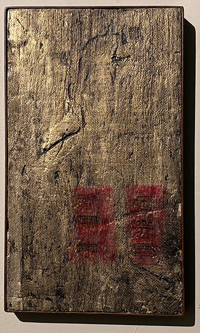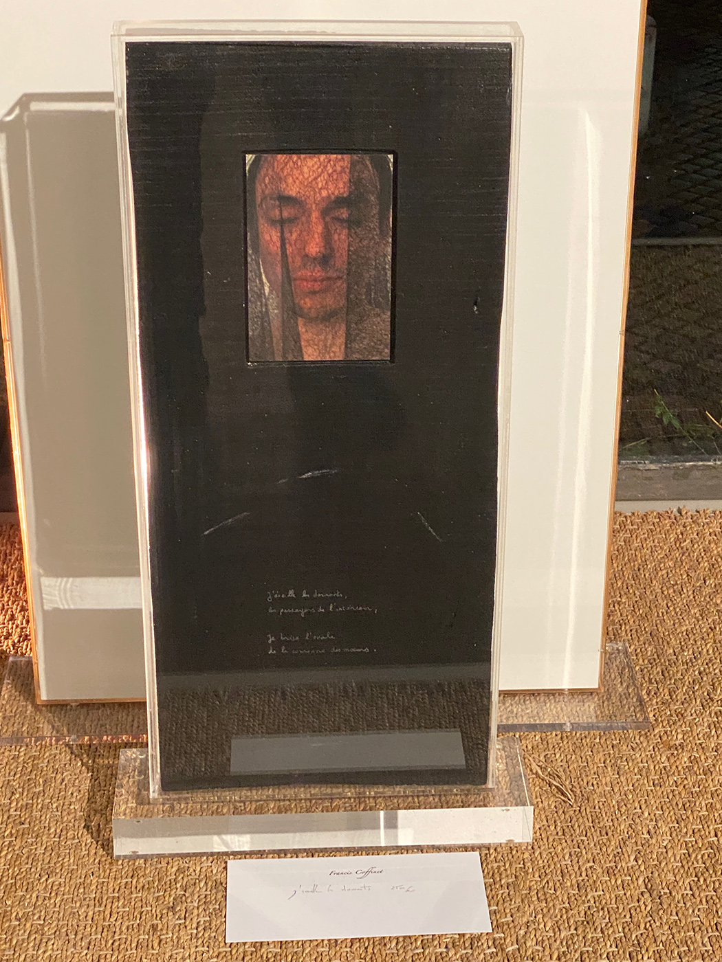 L’or est présent dans les créations de Francis Coffinet, mais il y est transformé, comme volontairement altéré. Il perd son état premier pour devenir un reflet modifié de l’âme humaine. Ces enclaves d’or, travaillées avec une minutie presque impatiente, deviennent les portes qui s’ouvrent sur un autre monde, un monde où la fin est inévitable et vers laquelle il nous entraîne et d’où, à la fois, il nous observe déjà.