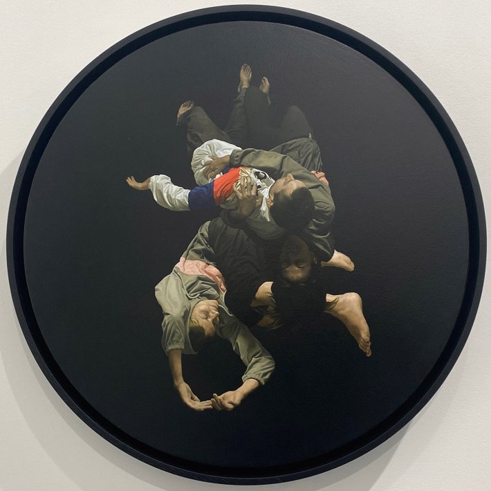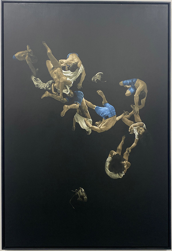 La petite exposition de huit peintures que la Galerie Nathalie Obadia propose fin 2023 est d’une cohérence remarquable. Considéré comme l’une des figures de proue de la peinture figurative, Guillaume Bresson, né à Toulouse en 1982, est aujourd’hui installé à New York et connu pour la réalisation de scènes résolument contemporaines, utilisant la photographie comme moyen et réinvestissant un mode de représentation issu de la peinture classique. Architecte de mises en scène chorégraphiées, Guillaume Bresson a recours au langage corporel et au mouvement, autant de clés de lecture de sa peinture. Pour cette cinquième exposition, il ne traite pas d’un sujet sociétal, mais de la chute des humains, qui pourrait être une fin du monde, une catastrophe ou une allégorie de l’explosion sociale.
