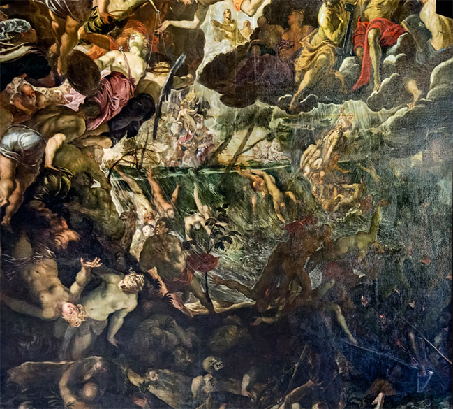 On peut noter l’analogie/la réinterprétation des postures mais aussi de l’environnement, comme la vague de Tintoret.