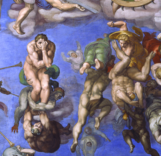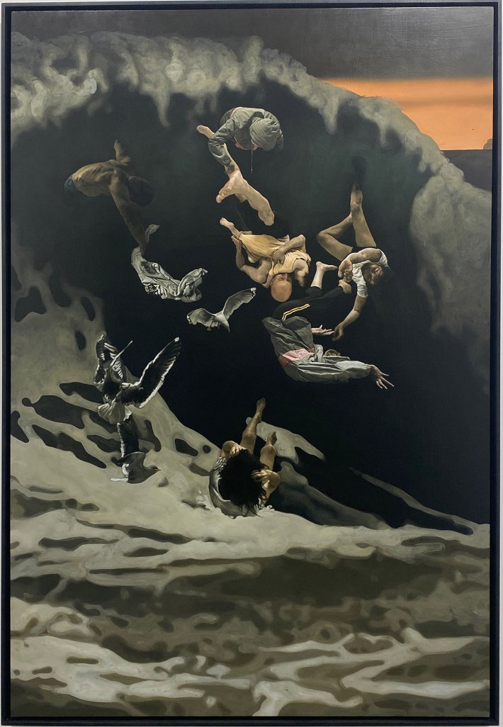 Mais, à la différence de ses précédentes peintures au caractère social marqué, cette nouvelle série se libère des éléments architecturaux et des perspectives. Ici, les personnages sans appui évoluent dans des milieux mouvants, vagues, nuages, ou se détachent sur un fond noir indéterminé, focalisant l’attention sur leur chute.