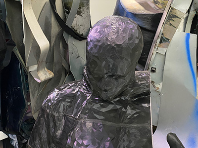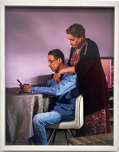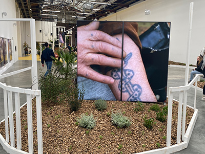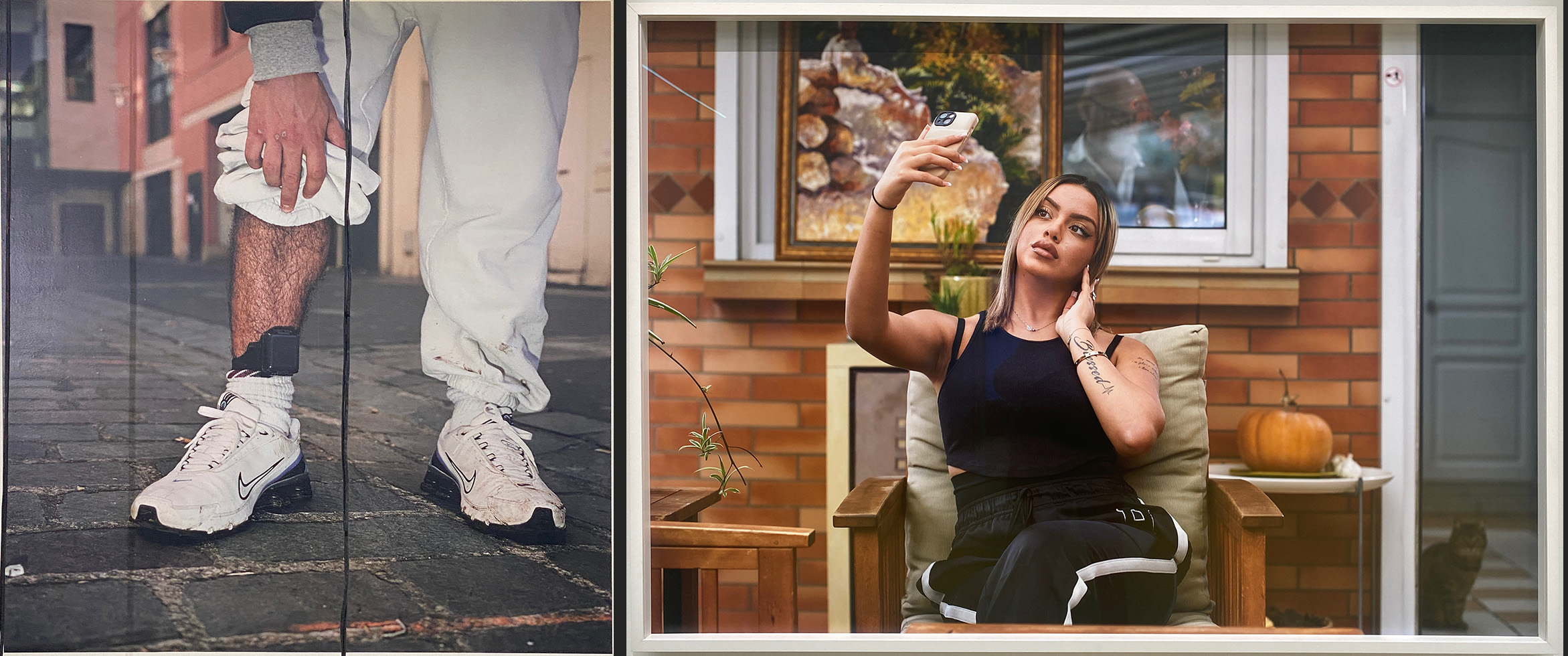 Cet univers de pots est ancré dans la société, car il laisse entrevoir, accrochées aux murs, ses belles et intrigantes photos : une jambe anonyme en basket, mais avec son bracelet électronique ,ou encore une influenceuse dans son univers du quotidien, avec son portable, une Narcisse du monde marchand, là où se niche de fait la violence.