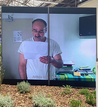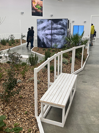 Il y a de l’espoir dans la manière dont il aborde les complexités (voir entretien à l’occasion de l’exposition) : l’enfermement des corps et des pensées, la représentation des identités, la détermination et le contrôle des langages. C’est ainsi que l’on parcourt une étrange muséographie s’ouvrant sur des pots de mimosa correspondant au désir de l’artiste de traduire les vibrations électriques de cette plante méditerranéenne en musique diffusée dans tout le parcours.