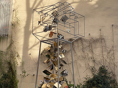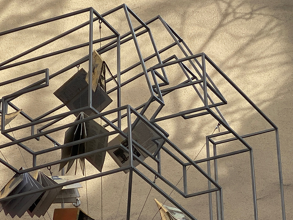 Les livres qui s‘envolent sont baignés de son. Ce sont les voix des auteurs diffusées dans l’espace public à partir de l’installation, grâce à un dispositif sonore intime. Les oiseaux qui ne manqueront pas d’utiliser l’œuvre comme nichoir ne devraient pas en prendre ombrage.