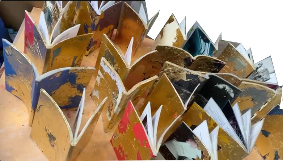 Pour en témoigner, Christian Delecluse a choisi certains livres, leur a donné une forme ouverte, les a ensuite enduits d’un produit durcisseur (donné par Sika, partenaire du Socle) avant de les retravailler à la feuille d’or. Les dessins de formes abstraites sont autant de pays et de continents de la pensée contemporaine, de rivages d’une géographie mentale. Comme des oiseaux, ils prennent leur envol, à partir d’un nid de culture : le Socle. L’ensemble des pensées fait monde, c’est notre monde. Les livres deviennent la trace de notre mémoire collective.