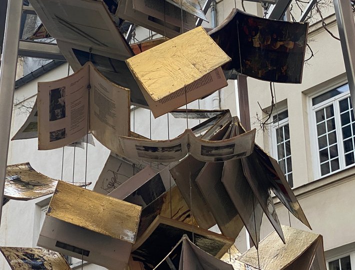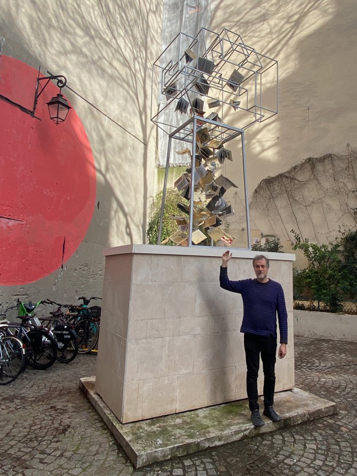 Alors que le paysage de l’édition est menacé, Le Socle érige un monument à la liberté d’expression. Des livres brillent au soleil, ils s’élèvent au-dessus d’un nid, le piédestal de pierre.