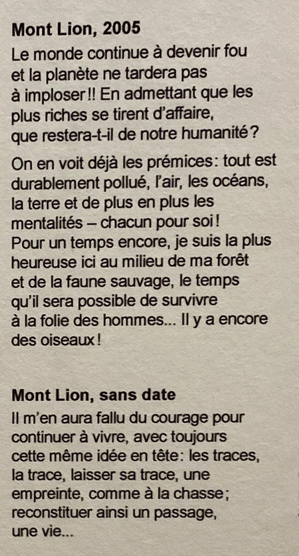 L’artiste assemble le tout avec des textes manuscrits provenant des carnets de notes d’Hélène, auxquels elle associe les siens à la manière de l’aïeule, ce « personnage de conte, gardienne de récits qu’il est important de préserver, de transmettre ».