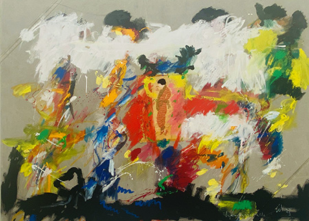 Hans Mendler aime la couleur, il en a besoin et en revêt ses toiles, des verres, des sculptures sur bois. Il aime partager son approche sensuelle et débordante. La galerie de l’Est, à Compiègne, l’accueille à nouveau avec générosité et permet d’apprécier ses nouvelles pistes d’intérêt, par les sujets ou les techniques. En découvrant l’ensemble, on se remémore l’américain Wilhem de Kooning qui produisait des compositions explosives issues des ambiances urbaines américaines et de leurs personnages. Mais Hans Medler est plus proche d’un autre expressionnisme, l’allemand. Né en 1950 à Stuttgart, il est de 9 ans plus jeune que Markus Lüpertz et de 10 ans l’ainé de Neo Rauch : il fait partie de cette grande peinture allemande, figurative et expressionniste. De l’abstraction, qu’il a dépassée, car, artiste exigeant et toujours en recherche, il la trouvait quelque peu paresseuse, il a gardé la liberté dans les traits et la couleur.