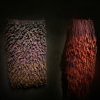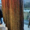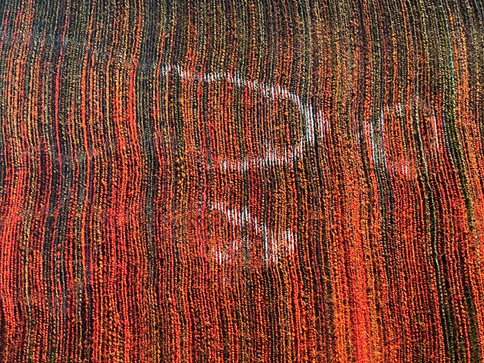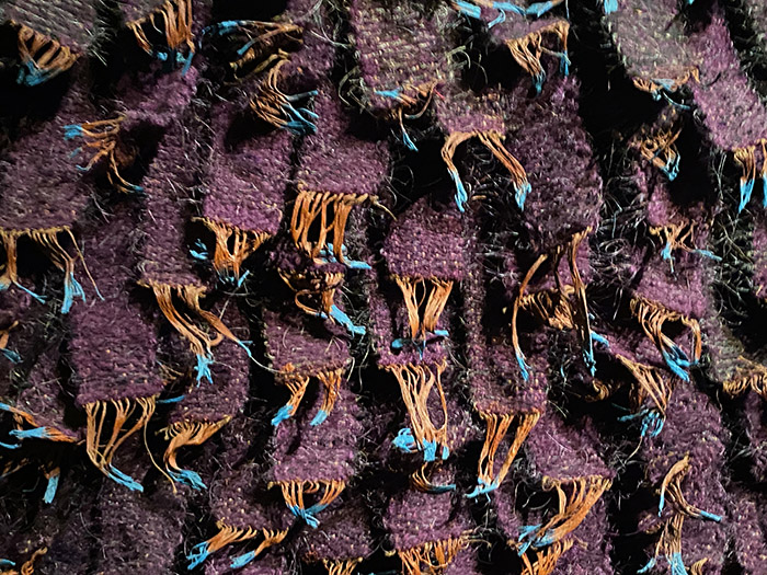 D’autres pièces fonctionnent sur l’effet de moirage où les bandes tissées sont assemblées verticalement ; face contre face. Elles vibrent à la lumière et sont des invitations à en faire le tour.