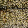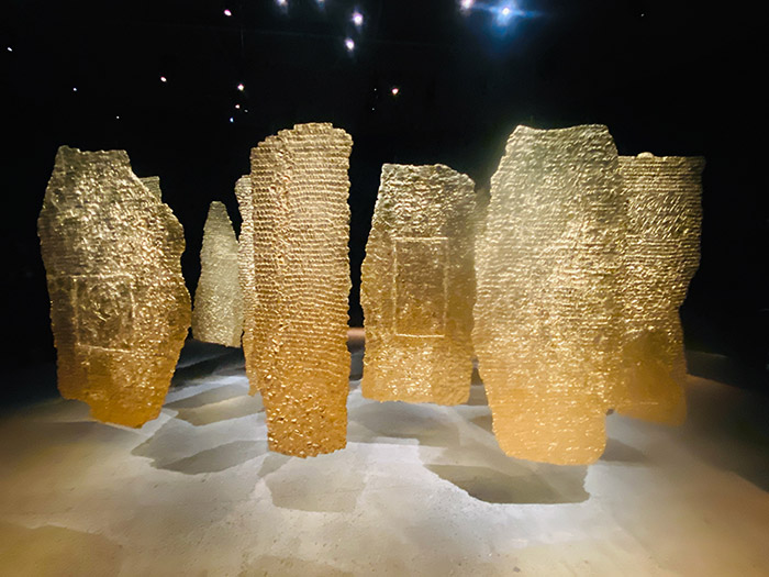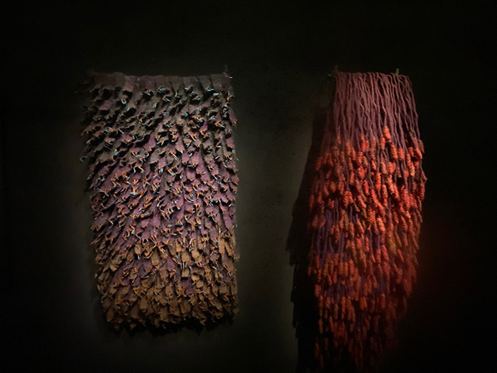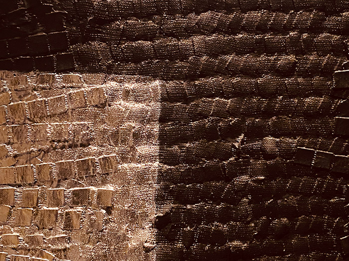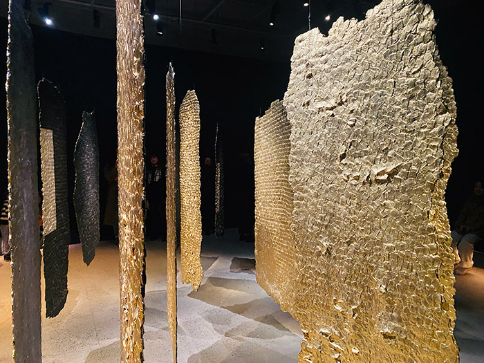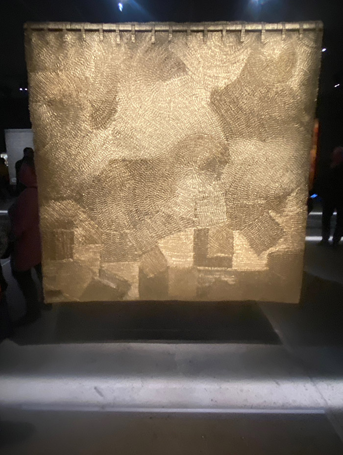 Entrer dans cette salle sombre où les seules lumières viennent du reflet sur l’or des structures tissées, avec ses sièges tout autour, fait penser à la chapelle Rothko à Houston. Et pourtant tout est différent, sauf le silence. Dans cette dernière, les visiteurs sont au centre, les grands tableaux sombres sur les murs octogonaux. Ici, cette série de stèles, débutée en 1996, est constituée de structures en coton, recouvertes de gesso de peinture et de feuilles d’or qui font oublier le textile.