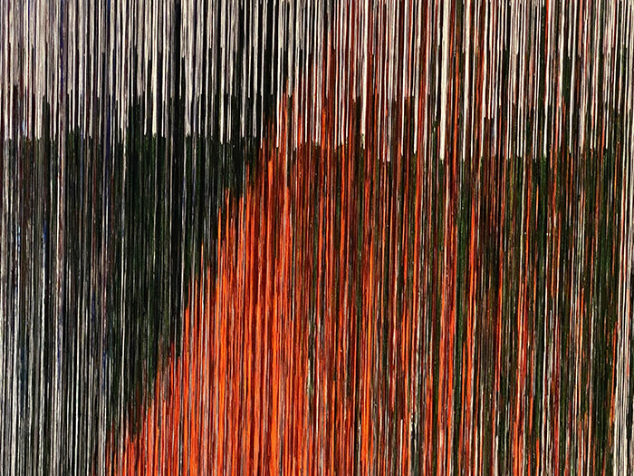 Les changements de matière correspondent à la quête de la couleur, la grande recherche de sa vie. Les crins de cheval ne pouvaient être peints comme elle le souhaitait. Ces représentations de l’eau et de l’air tombent comme de la pluie colorée sous formes géométriques. Le fil passe ainsi de la dimension 2D à la 3D.