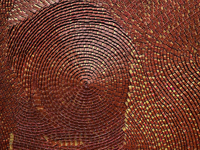 Il y a du spirituel dans cette salle, les feuilles d’or sont tissées et incrustées à leur tour ; c’est la matière du sacré, celle des églises catholiques de Bogota, de l’orfèvrerie précolombienne, de l’histoire du continent sud-américain qui a suscité tant de convoitises.