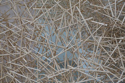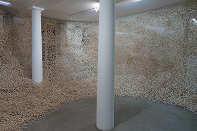 Cent mille baguettes chinoises structurent la totalité de la Galerie Kamel Mennour. L’artiste japonais, grand sculpteur de street art, utilise à nouveau un matériau pauvre et nidifie tout l’espace. Une sorte de corps parasitaire bienveillant semble traverser les murs et avoir envahi la galerie, de façon précaire, fragile, douce. Comme dans toutes les œuvres de l’artiste, cette sculpture déborde à l’extérieur par traces jusque dans la rue.