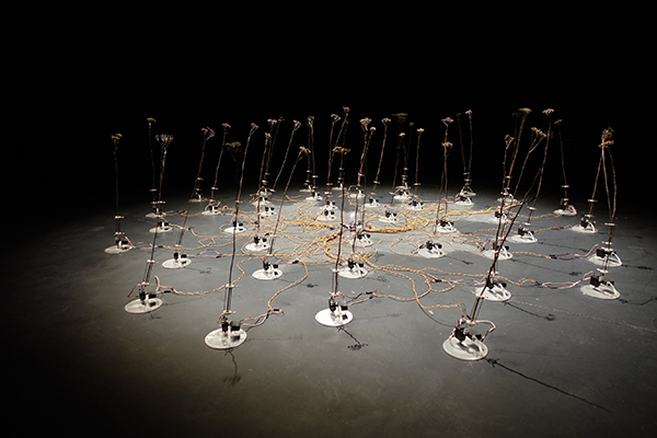 [**IMPULSE de Martin Messier*] : Une installation où le son et la lumière circulent selon une chorégraphie non-linéaire. Composée de cinq segments, chacun constitué de panneaux métalliques suspendus et reliés entre eux par des fils, l’œuvre s’active au gré d’une programmation lumineuse et sonore semi-aléatoire. Martin Messier propose ici une analogie poético-technologique du fonctionnement du cerveau et du flux de la pensée, sous la forme d’une circulation d’énergie donnée à voir par des trajets lumineux se propageant d’un panneau à l’autre. (>>>)