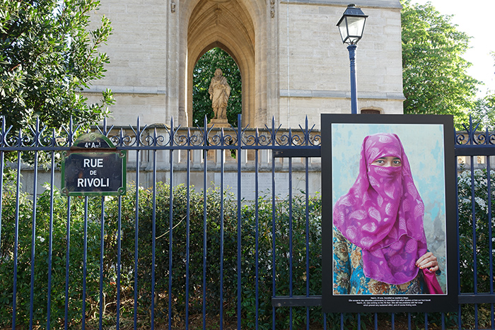 Avec la vingtaine de photos accrochées aux grilles de la tour Saint-Jacques, sur une des rues les plus densément passantes pour les piétons et les voitures, « Les vies brisées du RanaPlaza » présente un témoignage marqué par une double dignité : celle du regard d’un photographe et celles des femmes qui ont survécu à la catastrophe de l’effondrement des usines de confection du Rana Plaza au Bangladesh (24 avril 2013).