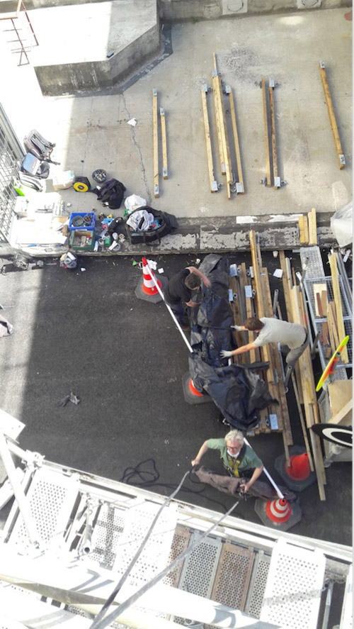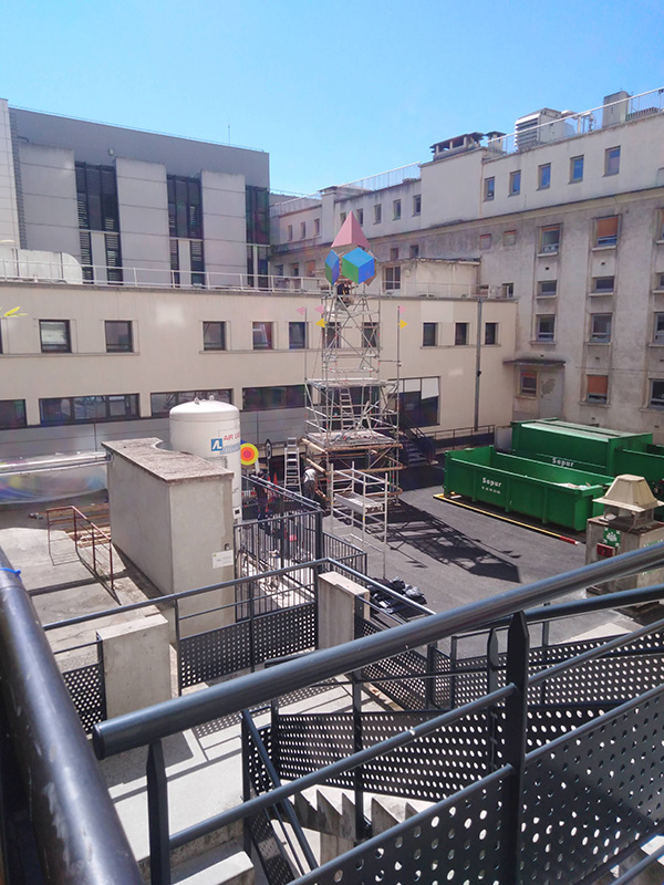 Pour réduire les coûts d’une telle opération, l’hôpital a chargé la régie de 6M3 de démonter l’œuvre du centre de Paris et de la remonter à Suresnes. Une fois tous les documents administratifs signés, la régie a réalisé l’opération en 15 jours, y compris la reprise de peinture et le vernissage pour que cette œuvre en bois peint puisse vivre le plus longtemps possible. Cette prouesse technique n’aurait pu avoir lieu sans l’implication et la générositéde nombreuses personnes, notamment les responsables de l’entreprise d’échafaudage Layher qui déjà avait fait le don d’une location-montage pour le Socle.