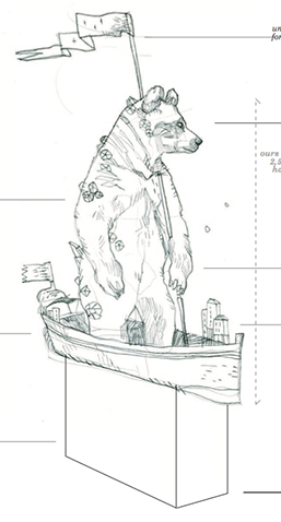 Dressée sur le Socle, sous les intempéries, leur installation comprenant une barque, une Ourse, des morceaux de ville, est revêtue de résine résistant au temps et montrant le caractère recyclé des matériaux.