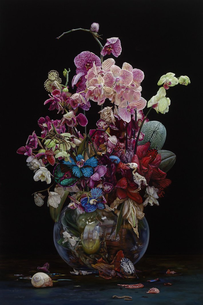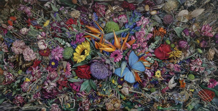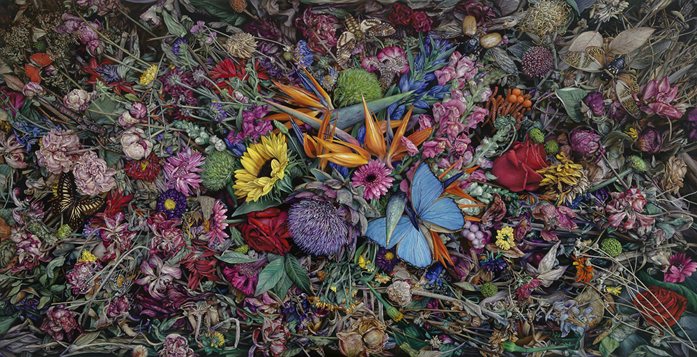 Ce sont, sur de grands formats, des bouquets de fleurs tels qu’en produisaient les peintres flamands des XVIe et XVIIe siècles. Ces derniers, y posaient une réflexion (voire une morale) sur le temps, l’usure, la vanité en offrant à l’observateur, des lieux de méditation où, depuis les boutons de fleurs jusqu’aux pétales tombées et les transparences des glacis aux éclats de lumière, se perdait le regard. Cindy Wright en actualise le propos. Dans l’espace des œuvres s’additionnent, s’entremêlent et se superposent diverses fleurs mêlant les saisons et les différents stades de fraîcheur à partir de véritables bouquets amenés dans l’atelier qu’elle peint avec le réalisme non pas photographique (la vue de loin) mais avec la gestuelle d‘un peintre qui sait comment faire entrer « l’air » dans les couleurs. En approchant, on remarque alors, enfoui dans ces parures végétales, l’une ou l’autre présence du monde présent, le nôtre, fait de fleurs artificielles, d’objets à jeter (comme les canettes, les emballages froissés) mais aussi de la finitude (un squelette d’oiseau) ou de l’éphémère (quelques papillons dont les ailes sont si proches des pétales). Ce faisant, et à la différence des peintres anciens, ces « intrusions » renvoient aux menaces d’un monde à la dérive qui, ainsi, superposés à un narratif connu (le temps qui passe à l’image des fleurs éphémères), elles réorientent le sens en désignant, mais d’une autre manière, la colère qui nous habite face à l’inéluctable dont ici, nous avons semé les graines.