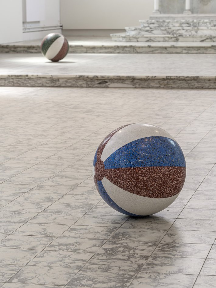 Cette fois, de manière tout aussi minimale, incluant une expérience personnelle (le décès d’enfants de son entourage) il ne propose en effet qu’une série de ballons de plage, que l’on connait légers et colorés mais qu’il métamorphose en les réalisant en terrazzo (un béton poli et colorié) et en les disposant sur l’espace vide du sol. Du fait de leur poids (150 kilos) et de leur texture, de par le vide qui les sépare les uns des autres sur le dallage de la chapelle et l’inattendu de leur présence, le signifié de cet objet de jeu s’inverse passant de l’insouciance à la pétrification. Ils disent l’insupportable, ils désignent la mort. Lourde. Opaque. Insupportable. Les ballons se sont figés.