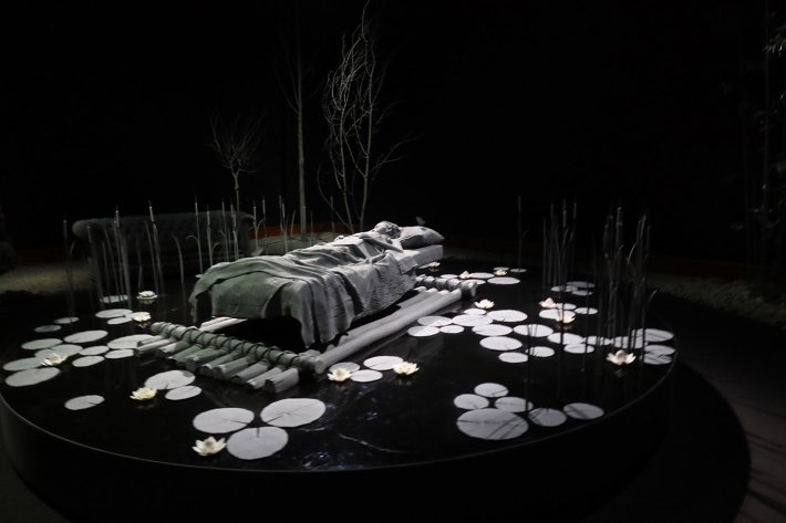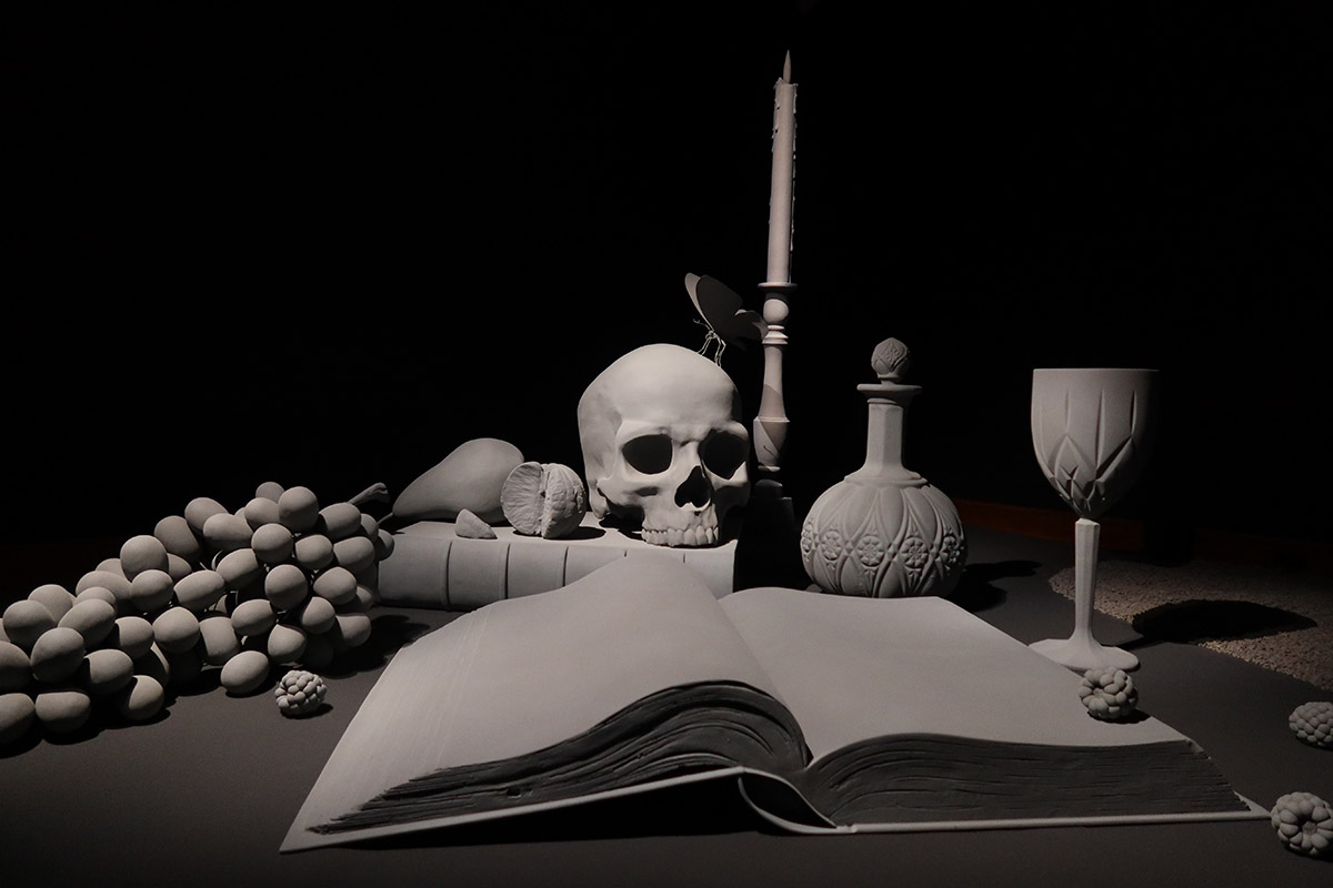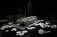 De tout cela, un mot s’infiltre peu à peu : vanité. Et du coup, on ne s’étonnera pas de voir, présenté de manière monumentale, un assemblage des incontournables du genre : crâne, bougie, verre à vin, carafe, raisons, livre ouvert et…mûres tombées là… (par hasard ?). Car, dans cette réflexion menée par le biais du poétique, l’artiste convoque évidemment, tout autant l’heure bleue que la mort, la rêverie que l’angoisse comme dans cette autre scène où, entourée par un bassin de nénuphars, une enfant s’est endormie dans un lit suspendu au-dessus d’un radeau de bois flottant sur une eau noire. Mais que font là, un livre ouvert posé sur son ventre, cette autre pile de livres posés à côté d’elle, les papillons qui l’entourent ou encre… une boîte de somnifère.