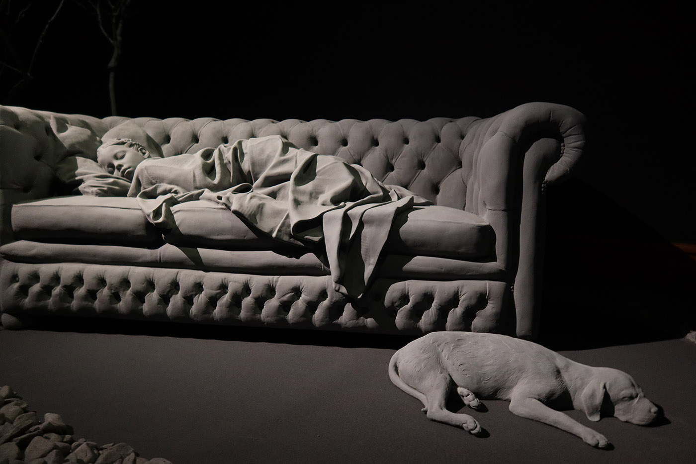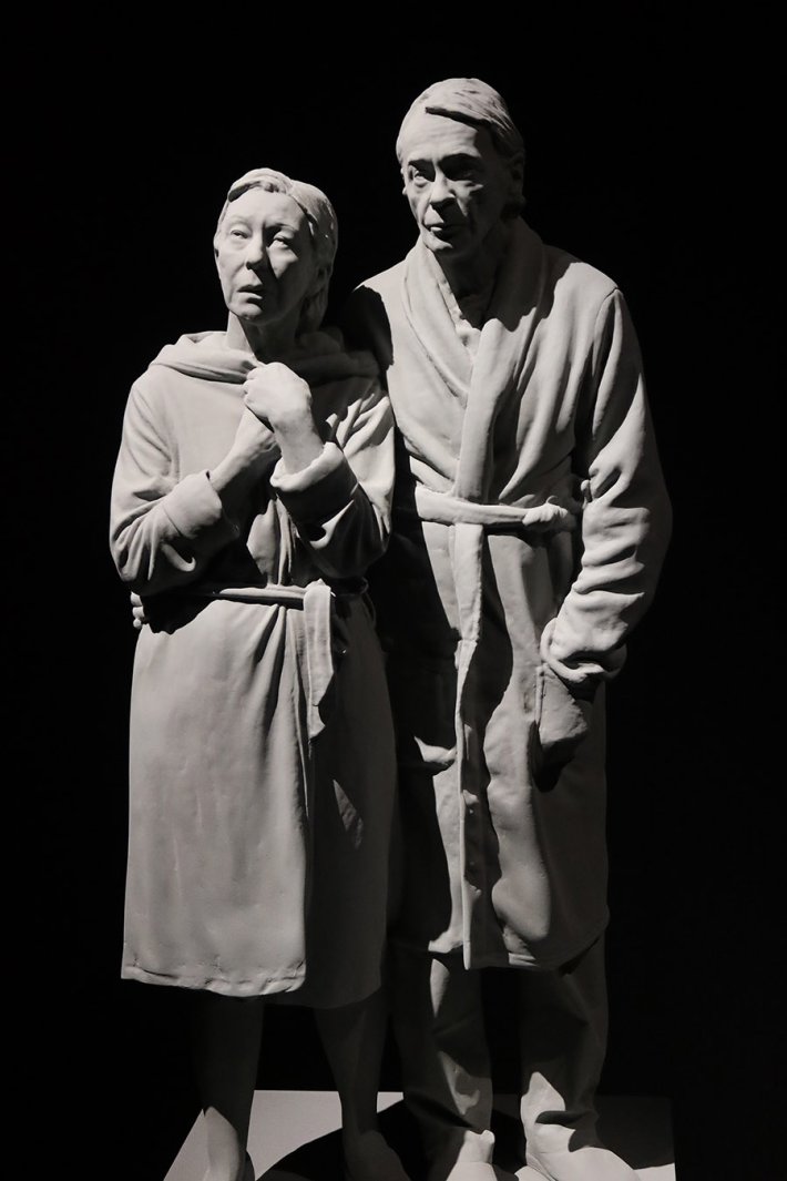 Des regards aussi posés sur ses propres parents. Soit, un couple de personnages en cire peinte revêtus de leur peignoir. Ils ne sont pas très vieux mais plus proches de la mort que des gourmandises de l’âge adulte. Surpris dans leur sommeil, ils se sont relevés afin de « voir ». Mais quoi ? On ne le saura pas. De même on ignorera ce qui se passera après. Pourtant, par leur attitude, leur geste suspendu et leur teinte cendrée, ils ne sont pas sans évoquer les figures des romains saisis par la colère du Vésuve. A quoi pensent-ils ? Qu’interrogent-ils ? La manière de représenter ce couple ne relève pas de l’art du portrait et ne vise pas l’hyperréalisme mais contient suffisamment de véracité que pour faire de leur présence et à travers cette fiction, une expérience à la fois hors du temps, universelle et familière.