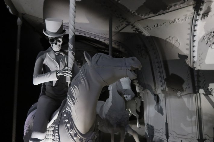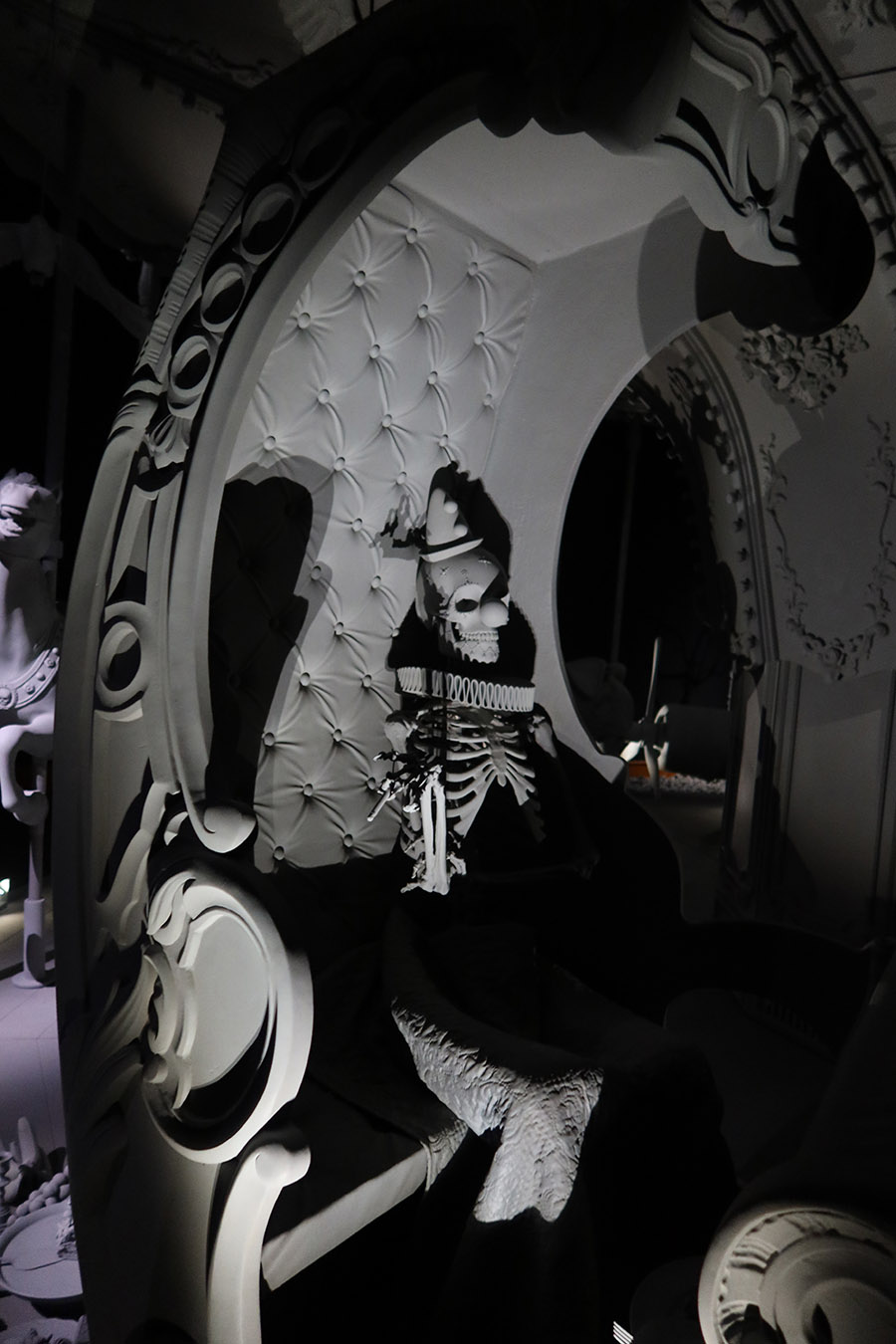 La mémoire, c’est aussi l’appartenance à une culture populaire et à une certaine tradition incarnée par James Ensor. Ainsi, ce carrousel imaginaire intitulé « Danse macabre » où les chevaux de bois et les oiseaux rencontrent les squelettes en robe longue, chapeau haut de forme ou costume de clown, un tumulte d’autant plus grinçant que s’y invite le vide, quelques amas d’objets au sol et la fixité du manège.