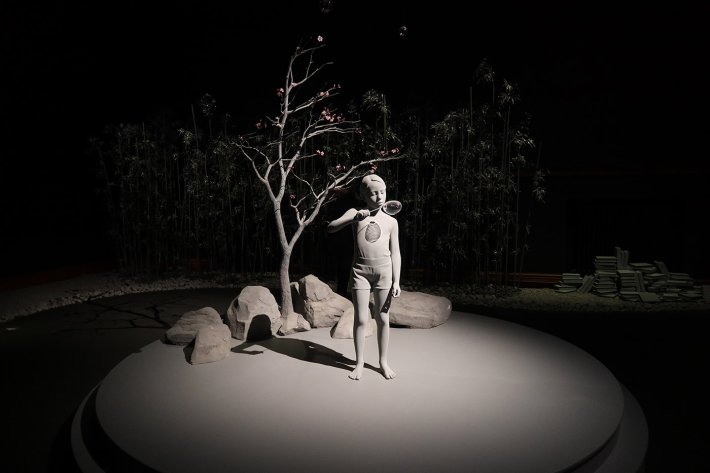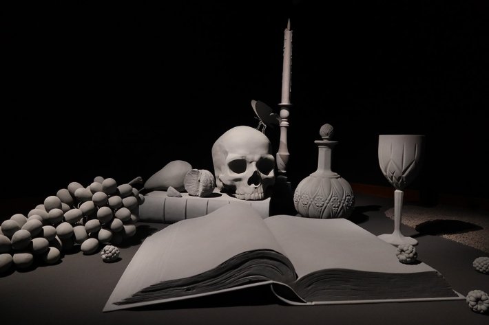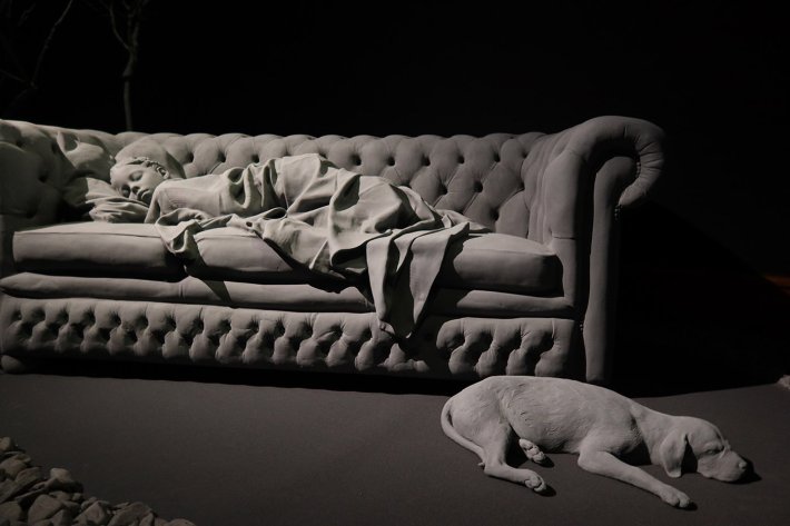 Tout au long, rien n’est totalement vrai. Rien n’est totalement faux. Les personnages, les animaux, les végétaux et les objets ont tous été modelés puis couverts de cette couleur grise qui a le pouvoir de suspendre le réel et le temps. De la même manière, disparaissent les traces des outils et de l’effort. Ne demeure que cette perfection à la Vermeer, un des maîtres de Han Op de Beeck. Dans l’exposition chaque salle propose des ambiances différentes, un climat particulier suggéré par le sujet lui-même, l’échelle, la technique mais aussi le soin apporté aux éclairages. Ainsi, chaque « scène » distille sa part de secret, une métamorphose annoncée, un basculement de sens, et toujours, sans heurt comme un souffle long et pénétrant.