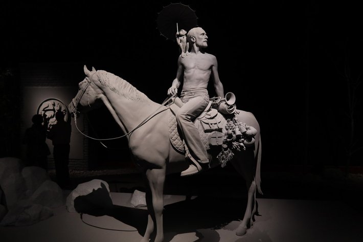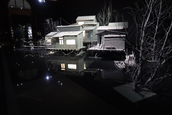 Par-delà, il y a les voyages et, de ceux-ci, la naissance de personnages qui, sans moralisme, font écho à bien d’autres voyageurs migrants comme ce cavalier énigmatique et solitaire emportant avec lui ses trésors : un sac de couchage, une trompette, un lourd trousseau de clés, des outils, des gourdes et un singe… Parfois, le visiteur découvre un village lacustre la nuit qui aurait pu être des Philippines et que Hans Op de Beeck, avec un soin tout particulier accordé aux éclairages, construit sans habitant mais avec des présences qui retiennent le regard comme celle de fenêtres éclairées ou encore d’une barque qui n’attend que le pêcheur.