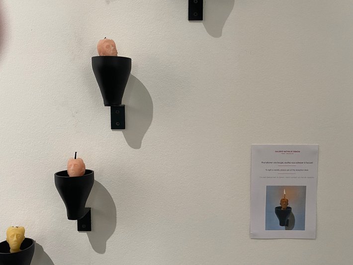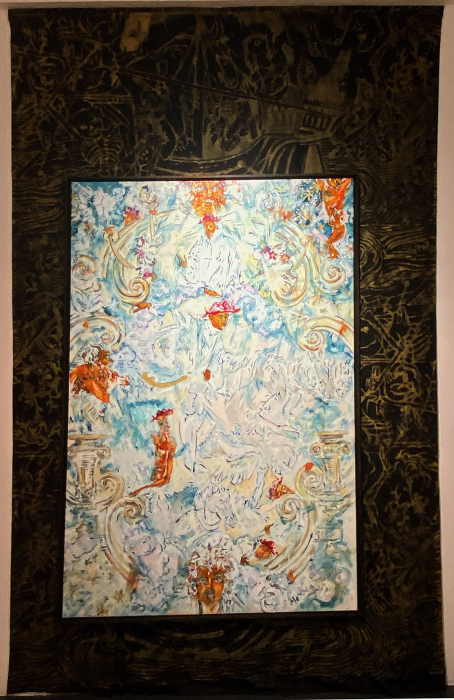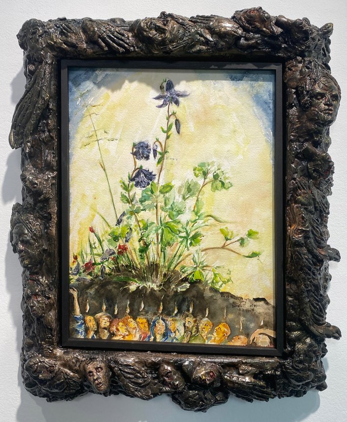 Dans cette exposition que l’on pourrait aussi intituler « Le poids de l’âme illumine la terre », on est très loin des vers de Baudelaire « Quand le ciel bas et lourd pèse comme un couvercle », Spleen, Les Fleurs du mal, où l’espoir est vaincu et l’angoisse domine. L’artiste flamand, lui, plonge dans de multiples références et illumine tout avec ses fulgurances de couleurs, de matériaux, de formes et de sujets : la cire, le feu, l’aquarelle, le vitrail, la peinture, les installations. Tels Pierre et Gilles, il sculpte parfois ses cadres en autoportrait, il déborde de tout.