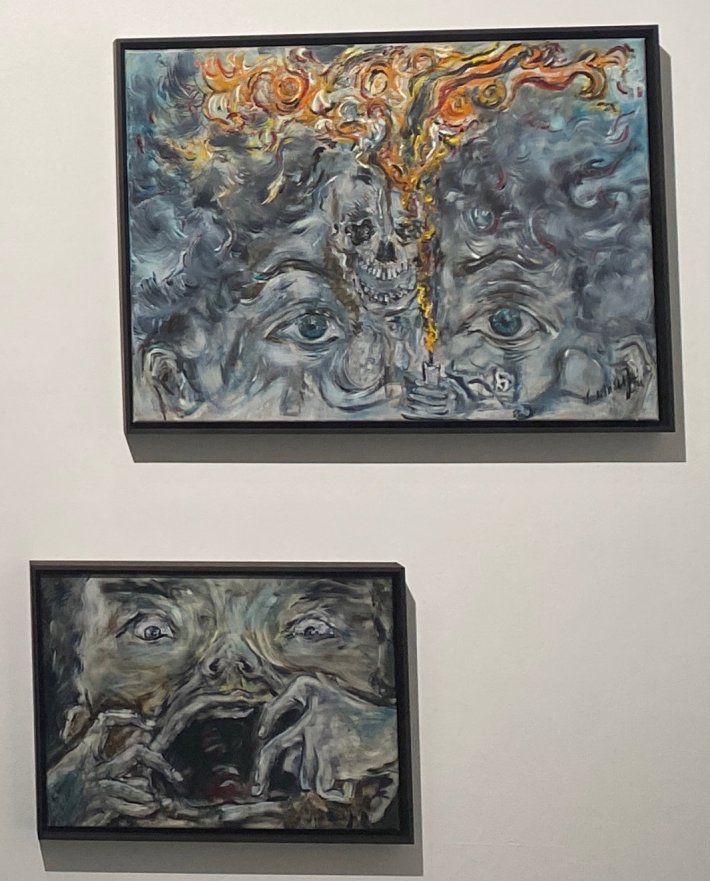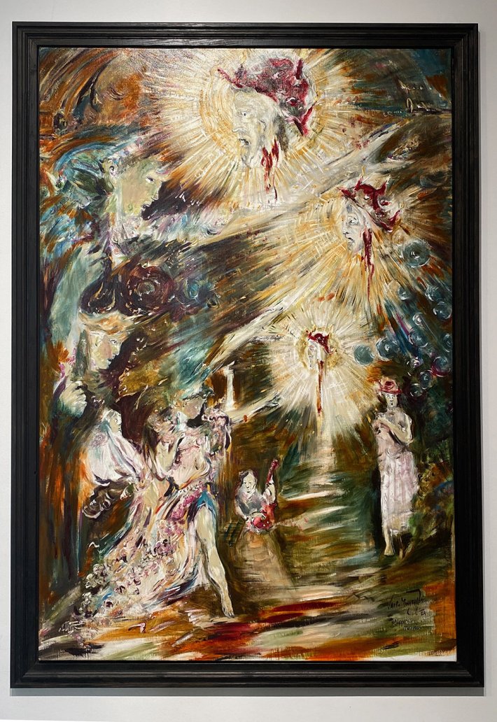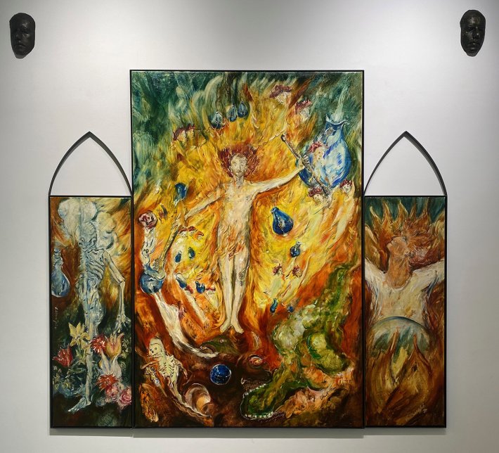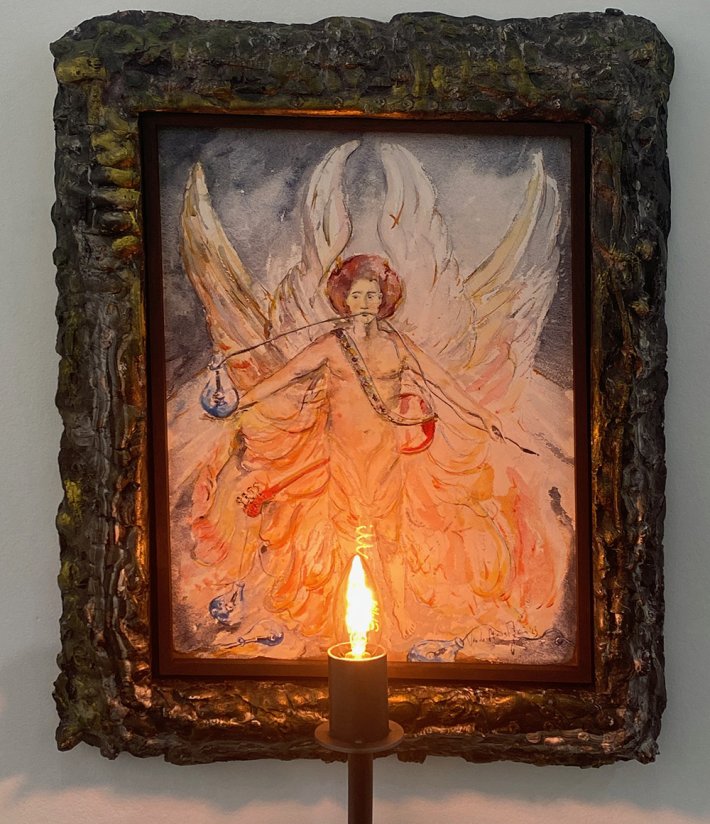 La multiplicité de ses autoportraits, y compris sous forme de petits cierges (des langues de feu de pentecôte ?) que l’on peut allumer, atteste que c’est bien lui qui s’exprime, avec son expérience des passages entre la terre et le ciel ; il est le témoin d’apocalypses qui reprennent le vocabulaire religieux (vitraux, cierges, triptyques, stations de quasi-chemin de croix, voiles, icônes, archange, rassemblement de pentecôte, etc.).