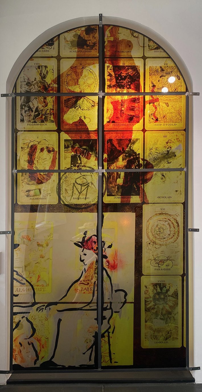 Ses vitraux mentionnent la figure de l’alchimiste, comme modèle personnel de l’artiste, car il l’est en transformant tout en vecteur de spiritualité : la sienne qu’il offre en partage.