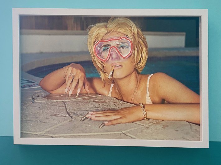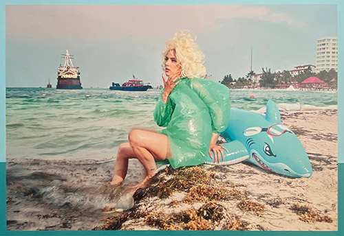 Prenant l’identité d’un autre, telle une actrice ou une performeuse, elle construit des situations et y intègre du bizarre avec du pastiche, des couleurs éclatantes, en se référençant à l’histoire des images. Avec la Touriste elle conçoit un glamour déstabilisant et faisant rire jaune : le masque de plongée au-dessus d’une bouche d’où pend une cigarette, des talons hauts sur des bords de piscine glissants, un simulacre de sirène avec un requin baudruche, etc.
