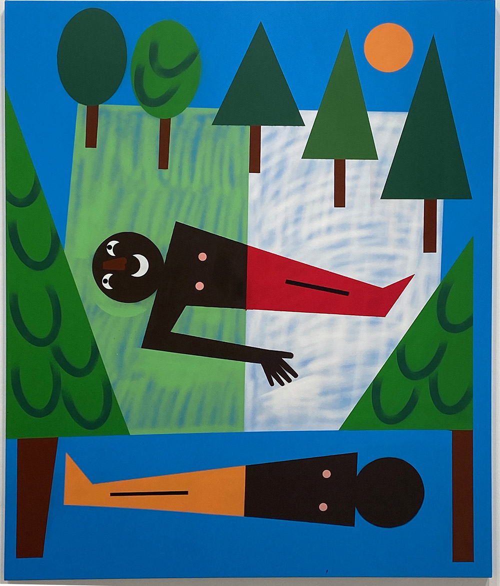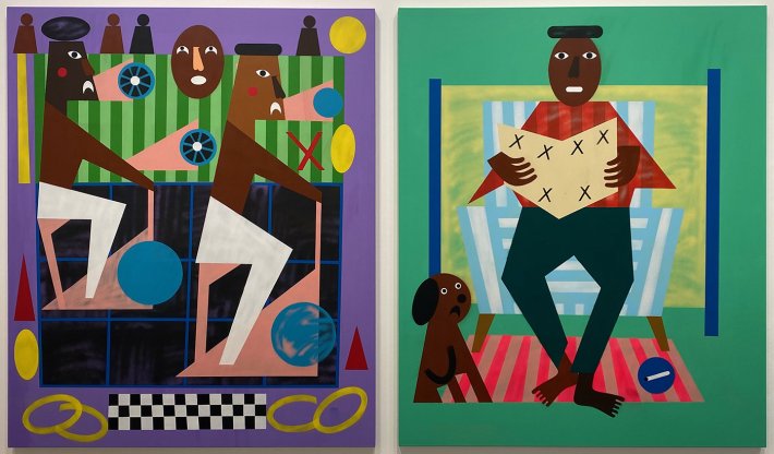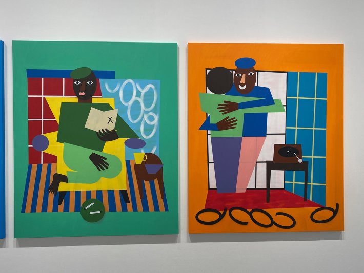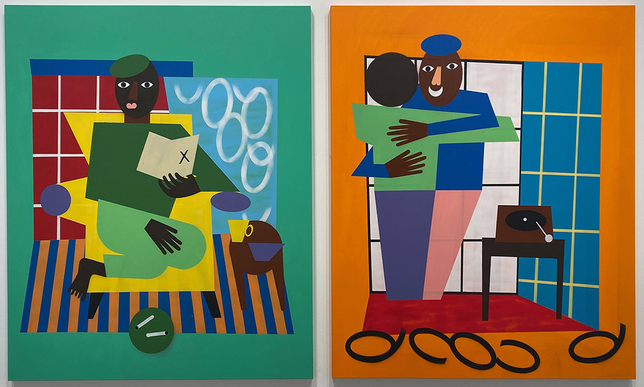 Nina Chanel Abney est exposée pour la première fois dans une des galeries parisiennes majeures, Perrotin, et s’exprime avec des couleurs éclatantes dans un langage qui puise dans Matisse et dans les cubistes [1]. Sa technique est d’aujourd’hui, l’acrylique et la bombe de peinture. La force de son style, combinant figuration et abstraction, s’exprime sans grand commentaire de sa part.