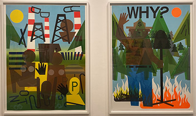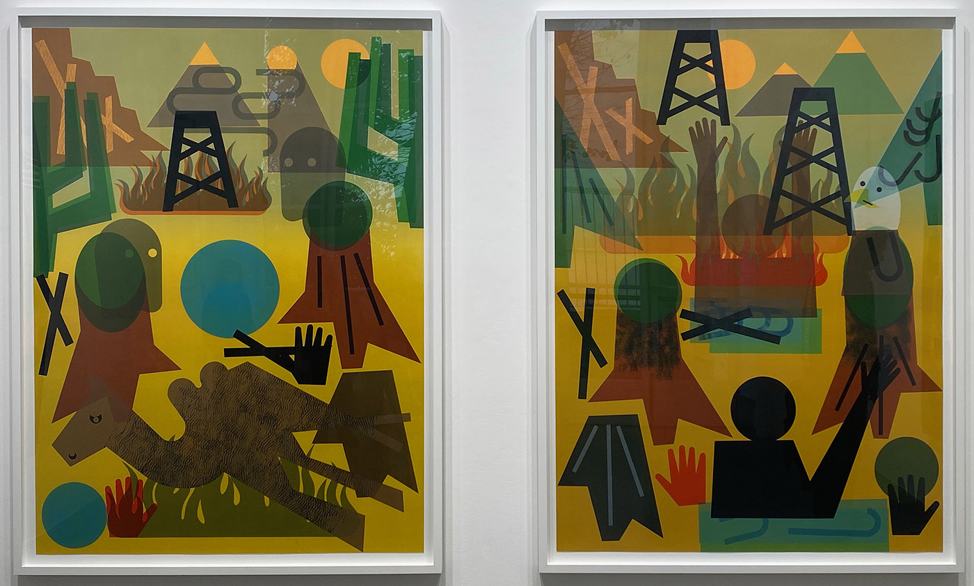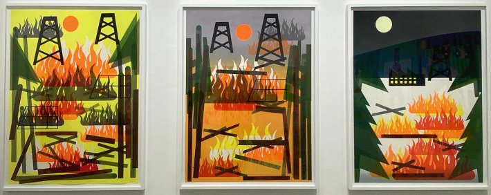 Les œuvres n’ont pas été exécutées après les récents grands incendies, mais les flammes sont partout : dans les derricks, dans les villes, dans les parcs.