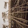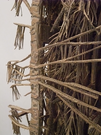 Un matériau, le carton ondulé banal et récupéré, insolite sculpté, collé, déchiré, griffé dévoilant la surface et les cannelures, où les composants de fabrication sont autant de coups de crayon, de pinceau.
