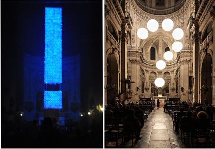 Religieuses rarement, méditatives parfois dans leurs finalités ou leurs résultats, elles se déployaient avant tout pour le plus grand plaisir des spectateurs. Le cultuel ouvrait son espace à du culturel, dans des cadres architecturaux incroyablement diversifiés. À la nuit tombée, les sens fonctionnent autrement et la lumière amplifiait la ville jusque dans l’espace du religieux. Les églises et temples qui faisaient partie des « projets associés », c’est-à-dire du « off » de la Nuit Blanche, donnaient leur touche à cette féérie urbaine et apportaient un contrepoint aux lieux plus officiels, car, au vu de leurs comportements, les visiteurs en y pénétrant n’étaient pas débarrassés d’un imaginaire lié au sacré.