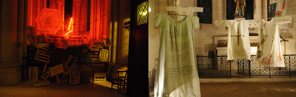 Curieuse église, dont le dynamisme est visible, accueillant de nombreuses œuvres d’artistes uniquement du quartier ! Travaillant les rapports de la lumière et du sacré, l’exposition a réuni les installations de six artistes. Une proposition en écho au 150e anniversaire du rattachement de la commune de Ménilmontant à celle de Paris. A travers les créations des artistes, résonnaient certains souvenirs de la Commune, des lavandières de la rue des cascades, des artisans du quartier…