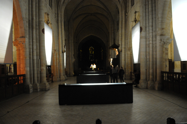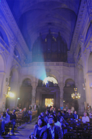 Serge de Laubier est un familier de ce lieu, puisqu’il avait déjà produit une œuvre de ce type en 2007. Mais comme c’est un chercheur et un créateur de machine électroacoustique, il s’est associé à des scientifiques de l’université Paris VI pour déployer sur toute l’église, y compris les bas-côtés, la lumière et rendre ses musiciens mobiles dans l’espace alors qu’ils étaient fixes dans la performance précédente. Les spectateurs assis et plus souvent couchés sur le sol étaient plongés dans une symphonie déconcertante où l’électroacoustique dialoguait avec l’orgue autour de l’idée que « la musique est la lumière des ombres ».
