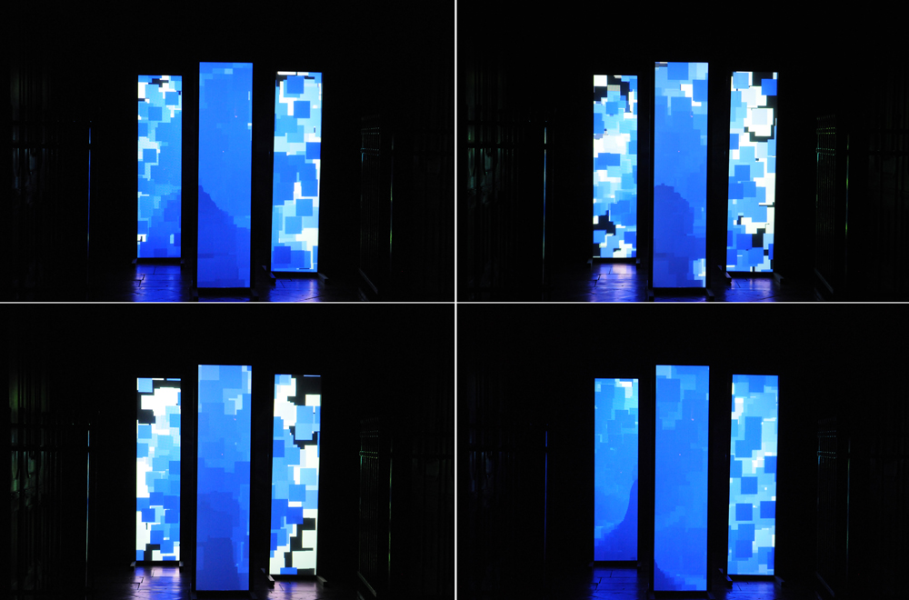 Alors que les autres œuvres se confrontaient par leur taille à la hauteur des nefs, celle de Hugo Verlinde était à taille d’homme et placée dans un déambulatoire bas de plafond, le reste de l’église plongé dans le sombre. L’œuvre, une installation vidéo en trois stèles verticales, laissait voir des marées de pixels bleutés, toujours différents, créant un espace immatériel et frémissant.