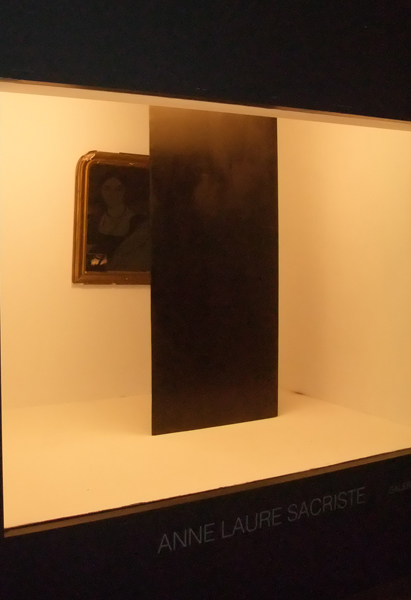 La vitrine devient un espace intime où la réplique inversée et métamorphosée du tableau originel désormais totalement indépendant du mur, offre au spectateur un autre seuil du visible dans lequel il est question d’évoquer un corps et un visage absents."