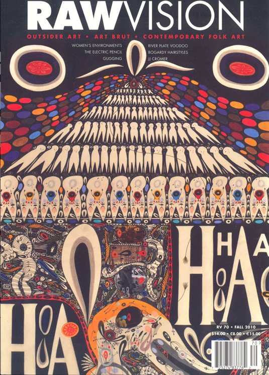 Exposition construite autour d’une revue anglo-saxonne, Raw Vision, basée à Londres, va être la première en 1989 à défendre la création populaire hors-normes et à lui donner une dimension internationale. A la fin des années 80, grâce à la constitution de collections privées et la tenue d’expositions pionnières, l’art brut était sorti de la confidentialité qui entourait les premières prospections de Dubuffet. Mais le dynamisme de son petit réseau de passionnés était sans commune mesure avec l’effervescence qui accompagne aujourd’hui sa reconnaissance publique, médiatique et institutionnelle. Le rôle catalyseur et fédérateur de Raw Vision fut essentiel. A un moment où la valeur de l’art contemporain professionnel était remise en cause, la revue montrait l’existence d’une autre scène artistique, méconnue voire ignorée, où l’énergie créatrice s’accomplit contre une culture hégémonique jugée matérialiste, aliénante et obsolète.