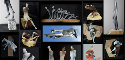 Les œuvres : Utilisation de rebuts de plomb, cuivre et bois pour évoquer tes textes bibliques. Un ensemble de sculptures.