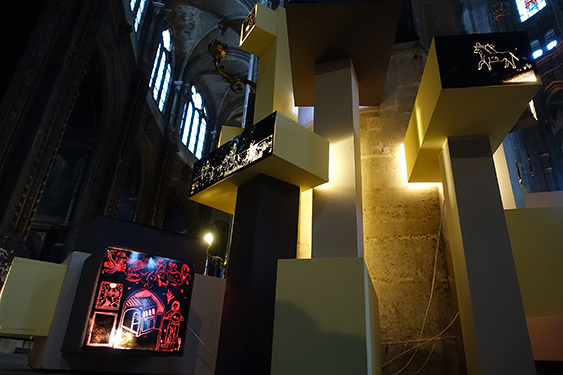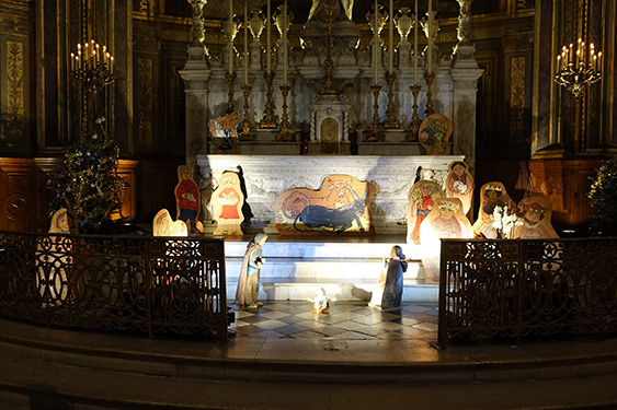 Saint-Eustache continue à surprendre par ses méthodes, en proposant non pas une crèche, mais trois de nature différente ! La crèche des enfants, toute en sincérité, celle des « adultes », intense car réduite à trois personnages, et enfin la crèche d’Anouk Rabot et Max Coulon, lauréats d’un appel à projets auprès des étudiants des Beaux Arts, ayant bénéficié d’un mécénat pour la réalisation.