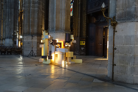 Ce qui est à voir n’est donc pas la crèche, mais une crèche, une installation affirmant sa modernité où les personnages sont remplacés par des formes architecturales, une crèche urbaine et non rurale. En alliant le dessin, la lumière, les boîtes, elle se veut pourtant narrative en puisant dans le vaste champ des représentations de ce mystère, en réinterprétant le caractère merveilleux lié spécifiquement à l’Évangile de Luc. En allumant successivement ses box, elle exprime une pensée du dévoilement. Cet ensemble assimilable à une sculpture joue en outre avec l’architecture du lieu, en enlaçant un pilier.