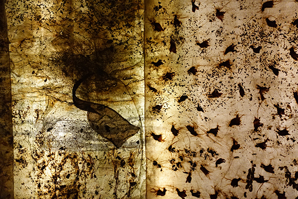 Comme pour faire vivre ces œuvres, la lumière omniprésente les traverse et joue sur la matière végétale utilisée : aplats de plusieurs couches de papier népalais, coton très fin, feuilles, branches, mauvaises herbes, argile, glaise, tiges ou bandes d’aluminium… Avec en toile de fond la nature comme capacité de régénération. Les différentes couches de matières évoquées portent cette notion du mouvement inexorable de la vie. C’est ainsi qu’entrent en scène les insectes, sans cesse plus nombreux à la mesure du désastre. Leur présence comme un signal, symbolise la prise de conscience et l’alerte du moment crucial, celui d’une disparition programmée. Tel un squelette suspendu, voire en lévitation, arrimé par des fils invisibles, l’insecte se montre dans un état presque fossile où le temps qui fait son œuvre n’exclut pas la fragilité de l’instant. Entre cocon et chrysalide, les installations à même le sol en papier coton, comme une gaze, paraissent tout à la fois solides et fragiles. Une œuvre tout entière naturaliste apparaît et nous rappelle le sentiment de l’éphémère et de l’instant, une forme d’acuité propre au monde des insectes à l’existence éphémère.
